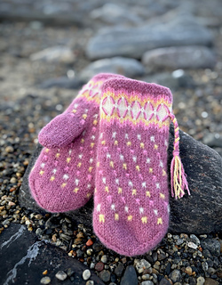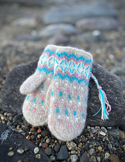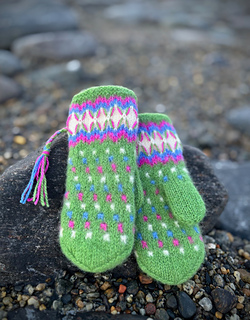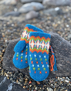 Barna har endelig fått sin drømmevott! Vottene er en fargerik hyllest til mitt kvenske opphav, og kan strikkes i 4 størrelser; fra 2-3 år og opp til 10-12 år. På disse brukes det enkel tråd Rauma Finull, og de kjennetegnes med en valgfri bunnfarge som kombineres med natur/ hvit og 2 andre valgfrie farger. Det kan gjerne brukes restegarn, da oppskrifta oppgir spesifikt garnforbruk. På mansjetten er det en lovikka-inspirert dekor med flette/ dusk. Vottene skal toves lett i vaskemaskin.
