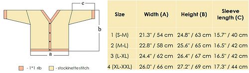 Yarn requirements for sizes 1/2/3/4: 6/7/8/9 balls