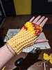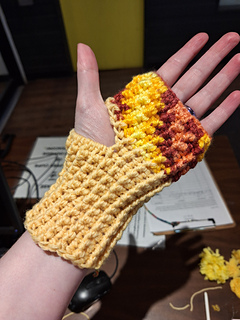 It’s a simple ribbed tube with a thumb hole, and a thumb gusset shaped through three decreases.