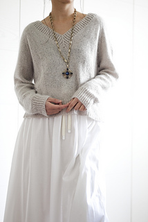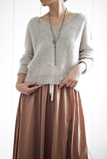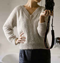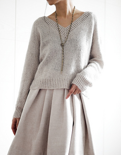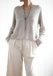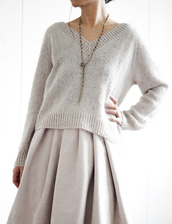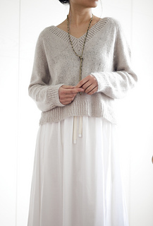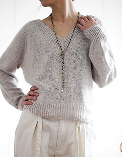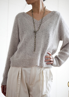 Basic V Light is a simple raglan pullover with a wide V-neck. Compared to the original Basic V, it has a looser fit and shorter cuffs. It is worked seamlessly from the top down, allowing you to easily adjust the length of both the body and the sleeves. The neckband is worked by picking up stitches along the neckline. No short rows are used in the pattern.