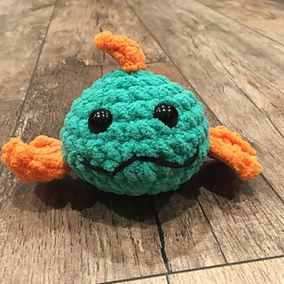Basket doesn’t have any sizing options and gauge doesn’t really matter; you could make Basket the Fish with any size yarn as long as you use a crochet hook that makes a tight enough fabric that no stuffing escapes, and size the safety eyes and the yarn or thread you use for the mouth up or down to match the size of the finished fish.