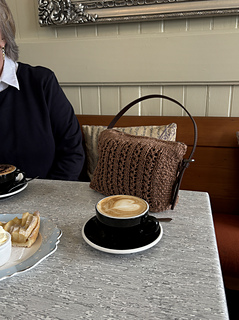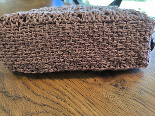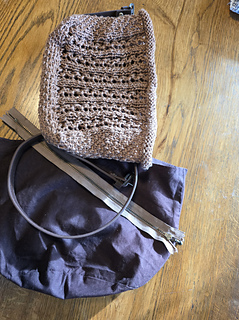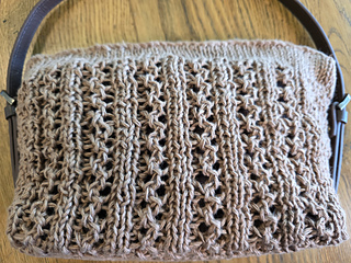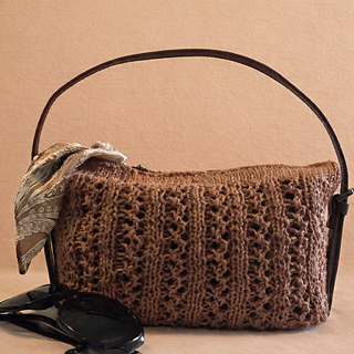 The bag is worked seamlessly from the top down in the round. A shaped base is created using short rows — echoing sock heel construction — resulting in a sturdy, seamless foundation. The finished bag is lined and completed with a hand-stitched zipper and leather strap for a refined everyday accessory.
