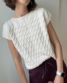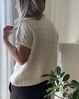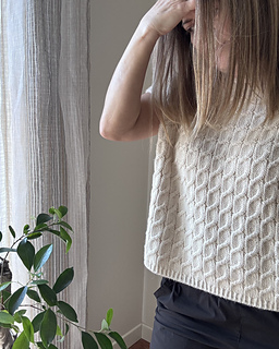Bauhaus Vest is a seamless top-down vest featuring an all-over cable pattern with a clean, architectural feel. Designed with a modular, rhythmic structure, it blends texture and simplicity into a modern, wearable silhouette.