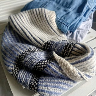 The Bay Panel Cowl is an adaptation of our Bay Panel Shawl, for a faster stash-busting knit. The cowl is in the form of a loop constructed with alternating panels of linen stitch, brioche stitch and garter stitch, with moss stitch borders. A twist in the loop allows it to show off both sides of the work and each of their dominant colours.