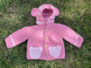 This pattern is easy skill level. The pattern is written in US and UK terminology. You will need to know basic crochet stitches. The baby jacket itself is made in one piece and the ears, pockets, and buttons are sewn on. The crochet pattern is 8 pages long and includes progress photos.
