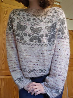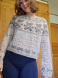Worked seamlessly from the top down, this sweater features a circular yoke where all shaping is built right into the colourwork chart. The pattern includes two chart options so you can choose your favourite design (or make both!). Finished with bow motifs above the cuffs and hem.