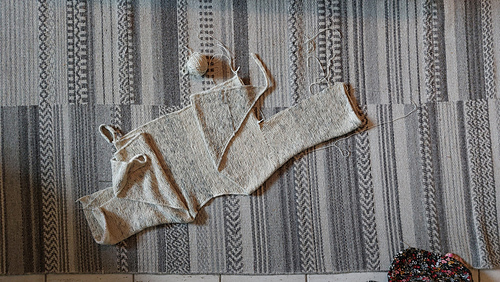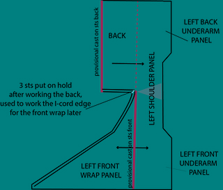 Starting at the center back with a provisional cast-on, you will work the back panel, then add stitches for the front using another provisional cast-on to finish the front in two directions with the wrap panel and the side panel (including the back).