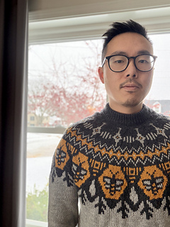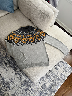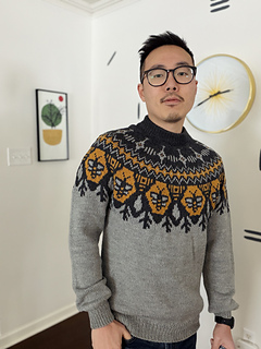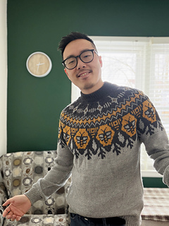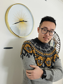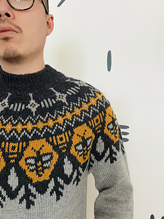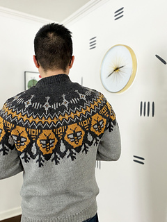The Bee Together Sweater features a meticulous color arrangement that creates strong visual impact using just three colors. This design stems from traditional stranded colorwork and imagination of the bees. The folded collar gives a finished look with or without a layer underneath. Sleeves are designed to stop at wrist so that you can go about your everyday tasks, such as knitting your next sweater.