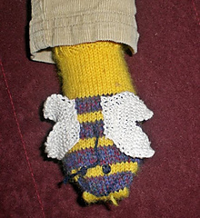 A long time ago, I made toddler sized socks, using a partial skein of yellow sock yarn. Unfortunately, I didn’t quite have enough to make a full pair, so I added stripes to the foot in a navy tweed. It was very obvious that these socks were a scrap yarn project. To make them look a bit more intentional, I got out some cotton crochet thread and made a pair of wings, appliqued them to the instep, and then added a face and antennae to the toe to make bee socks. I think they came out really cute, and my toddler at the time really liked wearing them. This pattern is for the wings, just in case you ever need to make socks that look like flying insects.