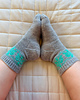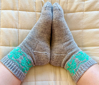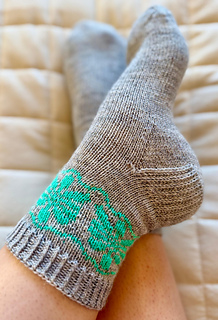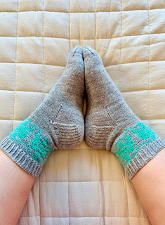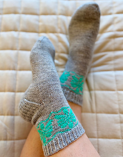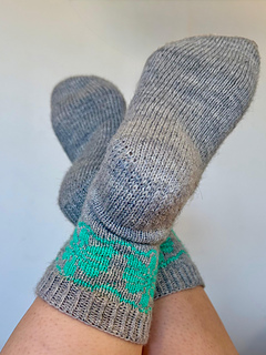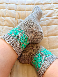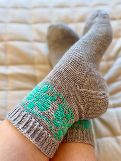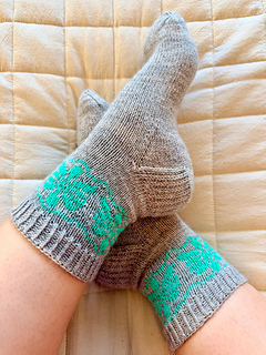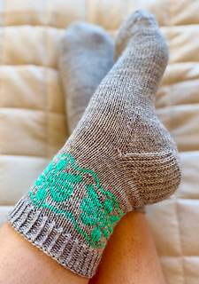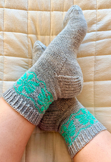 Estos calcetines se tejen desde la puntera hacia la caña. Están tejidos completamente en jersey, con un diseño en colorwork en la caña, puedes ajustar el largo del pie y la caña. Se tejen con una puntera redondeada, con talón reforzado y redondeado.