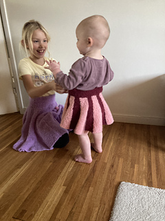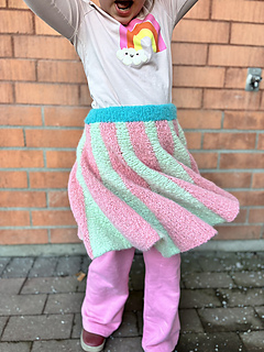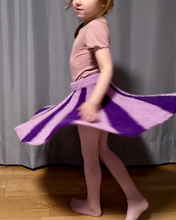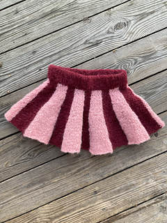 Bell Skirt Mini is worked sideways. You begin with a provisional cast-on and work back and forth, creating alternating stockinette and reverse-stockinette wedges. The wedges are shaped using short rows. To finish, the skirt is seamed using Kitchener Stitch. The natural curl of stockinette is used to create a pleated effect that drapes beautifully and flares when twirling.