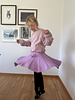 Bell Skirt Mini stickas på tvären. Du börjar med en tillfällig uppläggning och stickar sedan platt, fram och tillbaka, ett tyg med ömsom slätstickade och omvänt slätstickade kilar. Kilarna formas med hjälp av förkortade varv. Som avslutning sys kjolen ihop med maskstygn. Slätstickningens tendens att krulla sig används i detta plagg som en effekt för att skapa en veckad kjol som faller snyggt och står ut när man snurrar.
