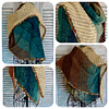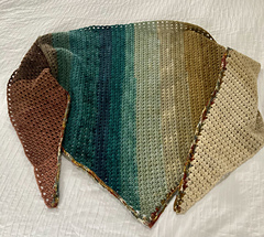 This triangular shawl is crocheted side to side, increasing with the first 12 mini skeins then decreasing with the remaining 12 mini skeins. The textured stitch pattern looks intricate but is simple to crochet. This shawl would work well with alternative colour schemes.