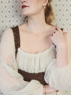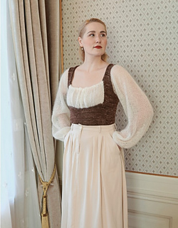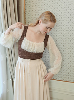 The Bennett Blouse is a romantic knit inspired by the Regency era of the early 1800s. The body, worked in solid, sparkly Athena, is reminiscent of a bodice worn over a delicate, gossamer chiffon chemise, with its bust and sleeves worked in luxurious Mohair Silk. The blouse is worked bottom up, and the sleeves are picked up at the end and worked down.