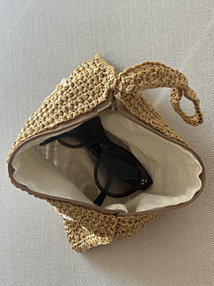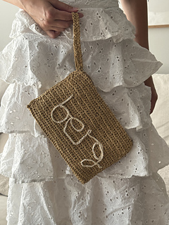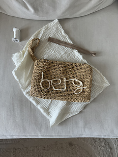 En klassisk clutch som er heklet i raffia. Detaljer som hank, glidelås og fôr. Den kan dekoreres med heklet skrift foran, skriv gjerne ditt eget navn for personalisering. Du starter med å hekle vesken, deretter syr du på glidelåsen for hånd, hekler en tråd til skrift, og syr på både skrift og fôr for hånd.