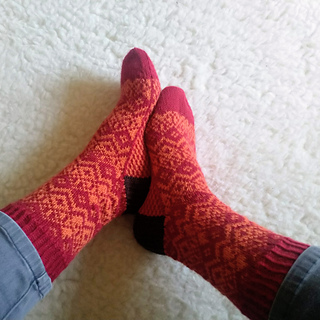 Teststrikket i Mellanraggi på p. 3 mm. Lengde legg: 17 cm og lengde fot: 22 cm. Garnforbruk: 106 gram, hvorav bunnfargen veide 66 gram. Strikkefasthet: 25 - 26 masker pr. 10 cm, målt på undersiden av foten. Ang garnforbruk på bunnfargen, det kan variere fordi du kan velge hvilken farge du ønsker på hæl og tå.