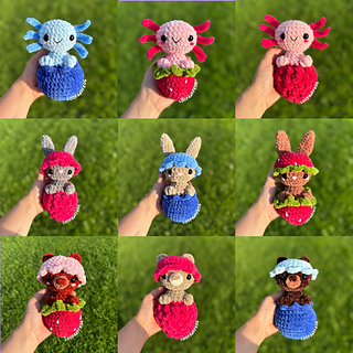 Meet the Berry Buds! They’re an adorable collection of 9 unique and customizable plushies. This low-sew pattern lets you mix and match 3 berry bases (strawberry, raspberry, blueberry) with 3 sweet animals (bunny, bear, axolotl) for endless cuteness. Each plush stands about 7” tall and works up quickly, making them perfect for market prep or last-minute gifts! Includes full-color PDF and a printer-friendly version.