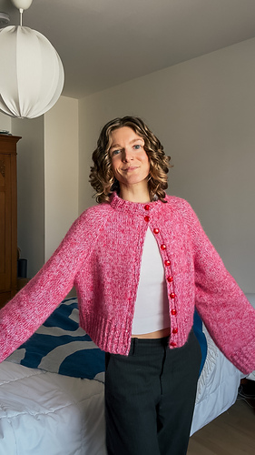 It is worked with 6 mm (UK 4/ US 10) circular needles and two strands of yarn. Begin with the cast-on, then shape the cardigan using raglan increases. Work the body to the desired length and bind off then knit the collar. The sleeves are knitted at the end.