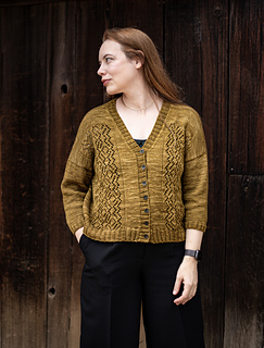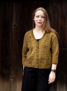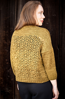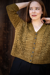 Bertana Cardigan is a study in lightness and texture, designed to showcase the beauty of lace in garment form. Worked seamlessly from the top down, this relaxed V-neck cardigan features striking geometric lace panels across the front and back, contrasted with simple stockinette at the shoulders and sleeves.