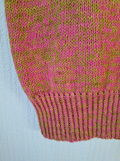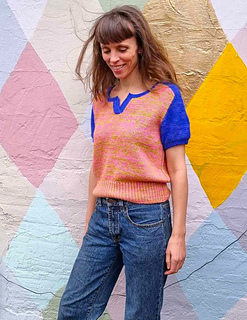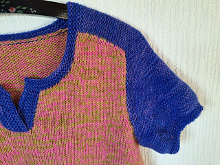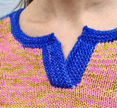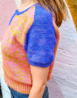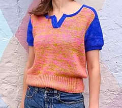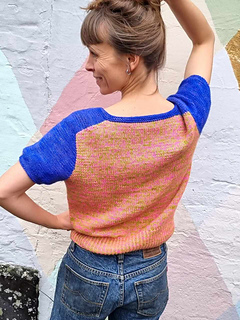 First, the two shoulder pieces are worked. Stitches are then picked up along these to work the back first and then the front piece. When the armholes are shaped with increases, the work is joined and the body is knitted in the round. The body is finished with a wide twisted rib hem. Stitches are picked up around the armhole, and the sleeve cap is shaped using short rows. The sleeve is then worked in the round and finished with decreases and a garter stitch edge.