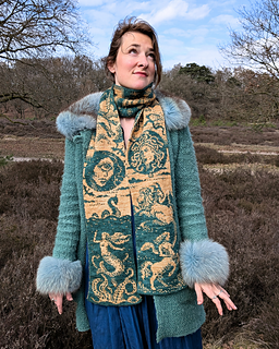 I designed this scarf to be a landscape: sea and land creatures appear at the bottom, with sky creatures above. The dragon is knitted sideways, so it sits upright when worn. The left and right sides align, tying the landscape together as a whole.