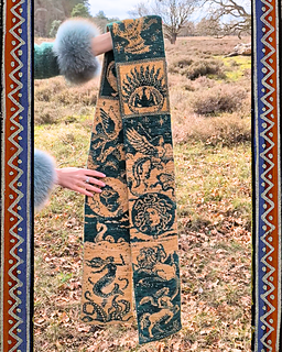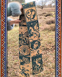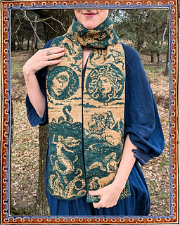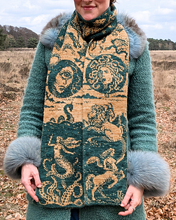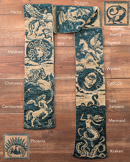 The Bestiary Scarf is a knitted, artistic encyclopaedia of Western mythical creatures, created using double knitting. This technique produces fully reversible colourwork without floats, with the colours inverted on each side.