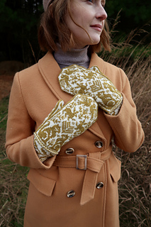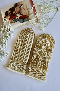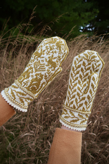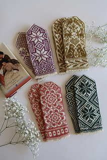 The Beth March Mittens are worked from the cuff to the fingertips. The cuffs begin with a provisional CO and the picot edge. The CO sts are moved to the spare needles, the CO edge is folded inside the rnd and up to meet the working rnd of sts on your main needle. The CO sts and the working sts are knit together to complete the picot edge. Next, a right leaning Latvian braid is worked, followed by the Cuff colorwork chart, and a left leaning Latvian braid. The hand colorwork is knit according to either the Left or Right Hand chart. The thumb sts are placed on hold via the afterthought thumb method while the hand is worked. When the hand is complete, the thumb sts are picked up, the waste yarn removed, and the thumb worked according to the Thumb chart.