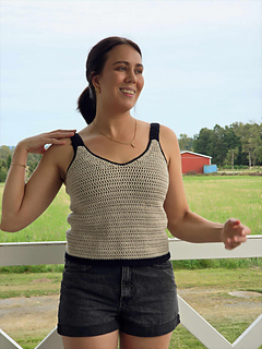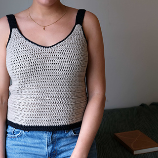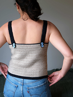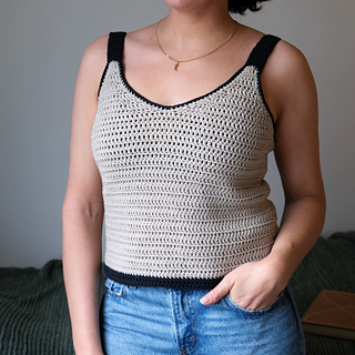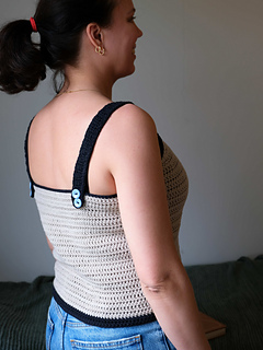 The Betty Button top is a nice and easy crochet pattern perfect for advanced beginners. It’s worked top-down without any sewing required, primarily using double crochet, making it a quick and enjoyable project. It features adjustable straps fastened with buttons, hence the name! The straps and edging use a contrasting color for a pop of detail. The Betty Button top is suitable for both casual and dressier outfits. Available in multiple sizes, this pattern is also easily adjustable to fit different body types.