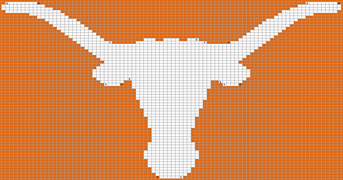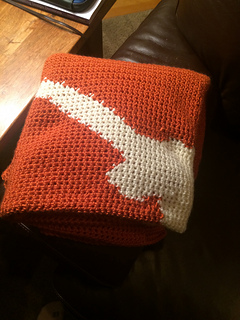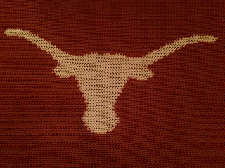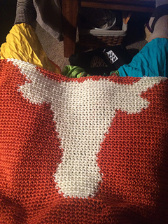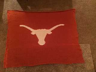 This pattern makes a 50”x60” throw blanket in burnt orange, with the Longhorns logo in off-white. It’s made with Caron Simply Soft yarn in Pumpkin (4.5 skeins) and Off White (1/2 skein) and a 10mm crochet hook.