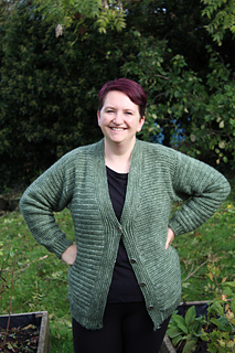 This cardigan is made up of 5 pieces that are seamed together at the end. The neckband and button bands are then worked.