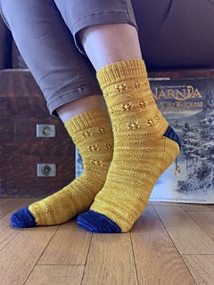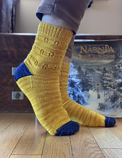 Inspired by the wonderful world created by CS Lewis in his books The Chronicles of Narnia, this pattern is designed to remind us that spring eventually comes, even after the longest of winters. The motif can look in turn like snowflakes or like flowers, depending on how you feel or how you look at them, and it makes these socks a little more special and magical. I hope knitting and wearing them makes you smile!