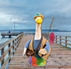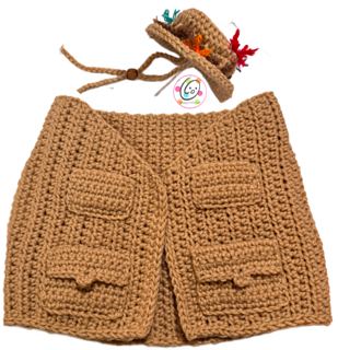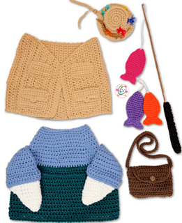 Sample yarns: Red Heart With Love Bluebell (shirt), Red Heart Super Saver - Teal (pants), Buff (vest and hat); Mainstays Brown (bag); Misc yarns for fish and ties on hat.
