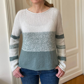 The pattern is written for working with two strands of yarn held together – a fingering-weight yarn and a fluffy, lace-weight yarn. The marled effect of the first color-block and the stripes on the sleeves are achieved by holding two different colors together for these sections. See last photo for the color distribution. Of course, it’s also possible to work the pullover with single strands of DK-weight yarn in your favorite colors.