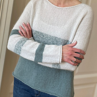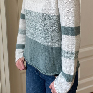 Der zweite abgebildete Pullover ist mit Knitting for Olive “Merino” und “Soft Silk Mohair” in den Farben “Limestone” und “Dusty Aqua” gestrickt.