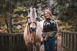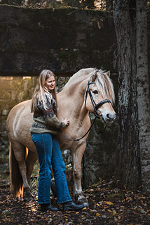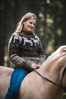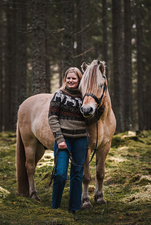 «Binjo sweater» is named after the designer’s fjord horse and is made to honour the Norwegian horse breeds and their vital role in Norwegian history. The sweater includes the selburose (an eight-petal rose often used in traditional Norwegian knitwear), trees, cart wheels, rose-painting(decorative painting, mainly used in Norway) and horse shoes. And of course a copy of the Norwegian horse breeds: either fjord horse, dole horse or Nordland/Lyngen horse. The sweater is knitted from the bottom-up with a circular yoke. The only making up needed is to sew a few stitches beneath the arms at the end. There is only one pattern and one number of stitches for all sizes, but it can be made smaller or bigger by changing the gauge. The original yarn used for the sweater is Léttlopi (Icelandic wool) and the gauge is 17 stitches per 10 cm. This gives a circumference equal to 100 cm around the body. How you do the math to change the size is thoroughly described in the pattern. Feel free to contact me if you have any questions.
