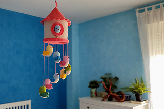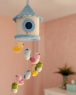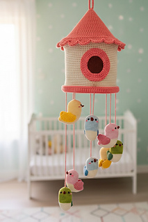 This is a PDF crochet pattern with step-by-step instructions to make a lovely Birdhouse Mobile with colorful amigurumi birds, perfect for decorating a nursery or any cozy corner of your home.