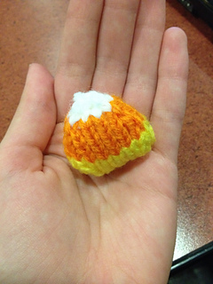 This is a pattern for mini candy corn, knit in the round. Size does not matter, but make sure that the gauge is tight enough that the stuffing will not fall out.