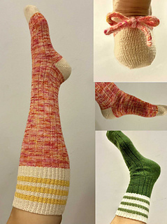 The next pair has a sportier look with a finishing stripe section. It reaches a bit up the calf. The last pair reaches up to the knees and ends with a different stripe section. For the knee-length socks, one skein is enough if the toes, heels and stripes are knitted in contrasting colors.