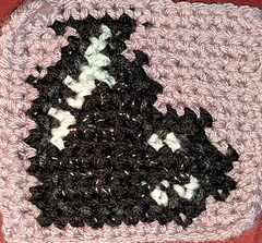 This is a tapestry crochet pattern of a glass filled with a black heart potion. I used 5 different colors of yarn. You can choose any colors you like, this can be done using any yarn and hook combo you want depending on how you want the end result to look. I use worsted weight with a 4.5 mm hook.