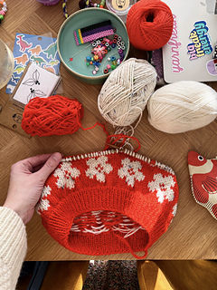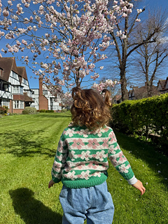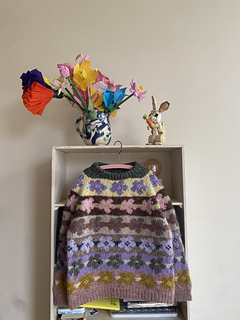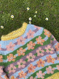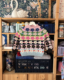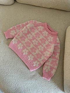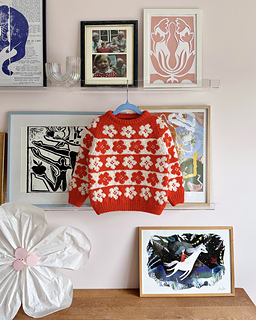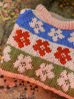The Æbleblomst Sweater Mini is worked from the bottom up in a floral, all-over stranded colorwork motif. The body and both sleeves are worked separately, after which the parts are joined and the yoke is worked in the round with raglan decreases. After the ribbed cuffs and an initial increase, the sleeves are worked straight. The shaping of the neckline is done by binding off the centre neckline stitches and then binding off stitches at the beginning of each row (while continuing the raglan decreases). Once the neckline is shaped, the remaining stitches are bound off, and new stitches are picked up along the neckline for the folded neckband. Lastly, the hole under each sleeve is grafted.