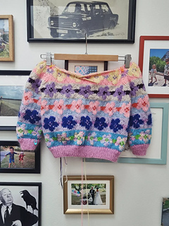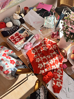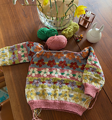 My first version is a size 4-5 y, and it’s a multicolored version worked in a number of different qualities from my stash: Some leftover yarn from my own Æbleblomst Sweater, Peruvian Highland Wool from Filcolana, Atlas from Sandnes Garn, and Merino Aran from Hedgehog Fibres. I’ve uploaded a picture with most of the color codes here.