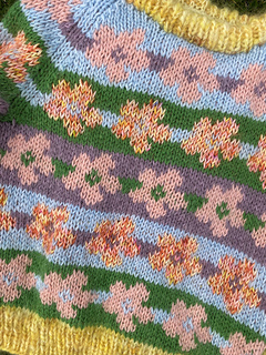 The level of the Æbleblomst Sweater Mini is advanced beginner/intermediate, and the pattern contains colorwork charts as well as written instructions.