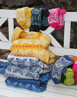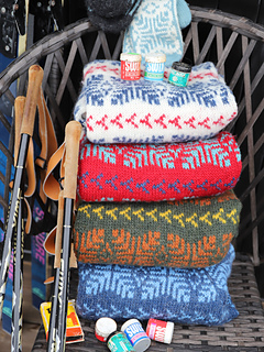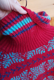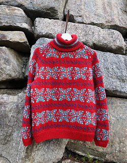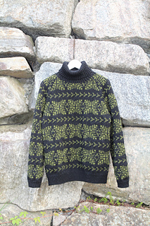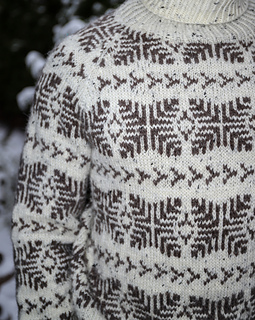 English: Inspired by the wide mountain landscapes of Blefjell, this sweater features a bold colourwork pattern that runs across the body and sleeves. The relaxed unisex fit makes it an easy and comfortable sweater for both outdoor adventures and everyday wear. The sweater is worked from the bottom up in the round. Body and sleeves are worked separately and joined for a raglan yoke. Short rows shape the back neck.