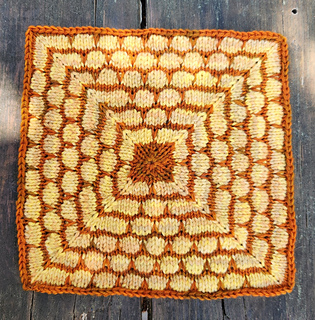 Blister or coin stitch tends to spread out and loosen, so I go down two needle sizes from what I would normally use to tighten it up. In the beginning things will seem too tight but trust the process! This square is made from the center outwards and can of course be made to any size. The photo model was intended as a blanket square, but with cotton yarn and it would also make a lovely dishcloth. The pattern requires yarn in two colors.