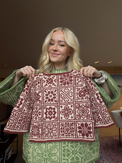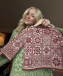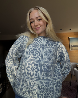 Blomsterkaos Junior is an oversized sweater for children with a boxy fit. The sweater is based on the original Blomsterkaos pattern for adults, but adapted with smaller flower motifs. The pattern has been charted and adjusted for each individual size. The flowers on this sweater come in all shapes and forms and are placed in a scattered, playful way. That’s why it has been given the name Blomsterkaos Junior.