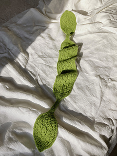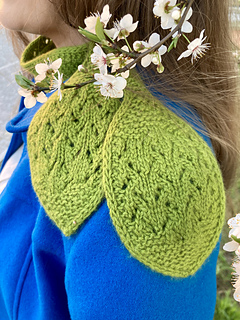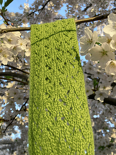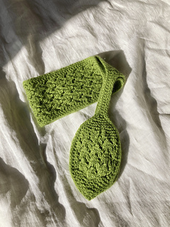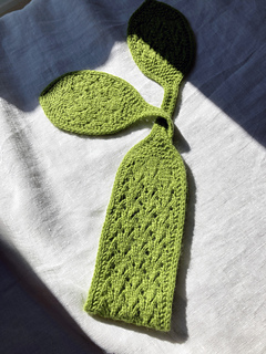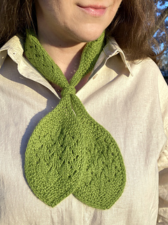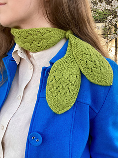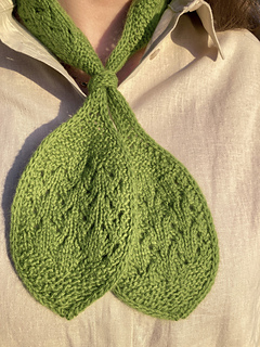 The pattern is knitted flat. The lace section is provided in charts, while the remaining parts are written out row by row. The scarf is finished with an I-cord bind-off.