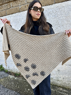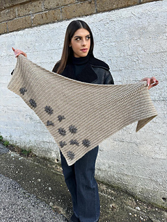 La lavorazione segue un andamento obliquo: si parte da una punta con pochissime maglie e, grazie a semplici aumenti, lo scialle cresce rapidamente fino all’altra estremità. Non sono previste rifiniture finali: il progetto è pensato per essere armonioso e completo così com’è, pronto da indossare una volta terminato.