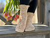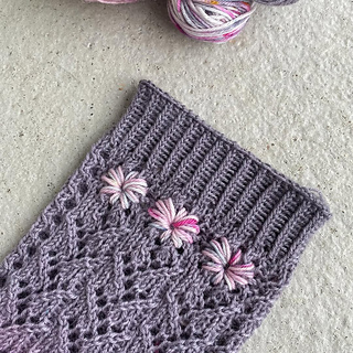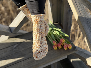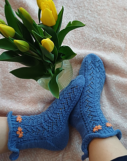 Blooming Vine Socks are worked toe-up in fingering weight yarn. Delicate lace vines travel up the front of the foot and continue along the front of the leg, while the sole and back of the leg are kept in smooth stockinette for comfort and easy wear. Right before the cuff, the vines turn into blooms and that’s what makes these socks a little bit special. The flower motifs are finished with simple embroidery, adding subtle texture, like actual flowers. This pattern includes charted and written instructions for the lace, both in English and Finnish.