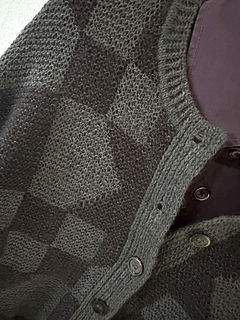 The blouse is worked from the bottom and up in garter stitches with squares in different colors. The front and back are worked separately and sewn together at the end. The blouse has a small slit in each side. The sleeves are worked back and forth and sewn on the body. On the front piece a button placket is worked and a small rounded neckline is worked at the end.
