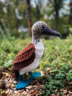 A finished Blue-Footed Booby made using Worsted Weight yarn is approximately 16” long from bill to tail, 15” tall from head to toe and 5” wide across the shoulders.